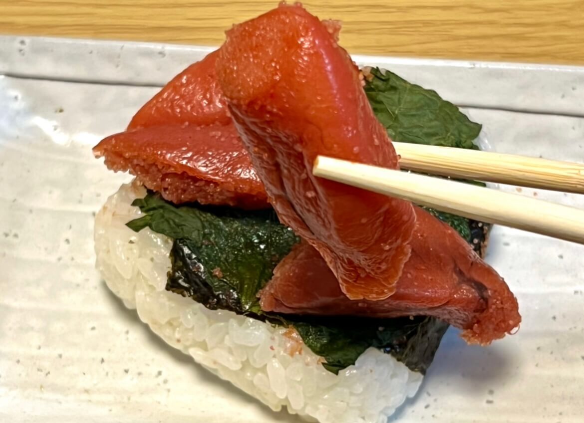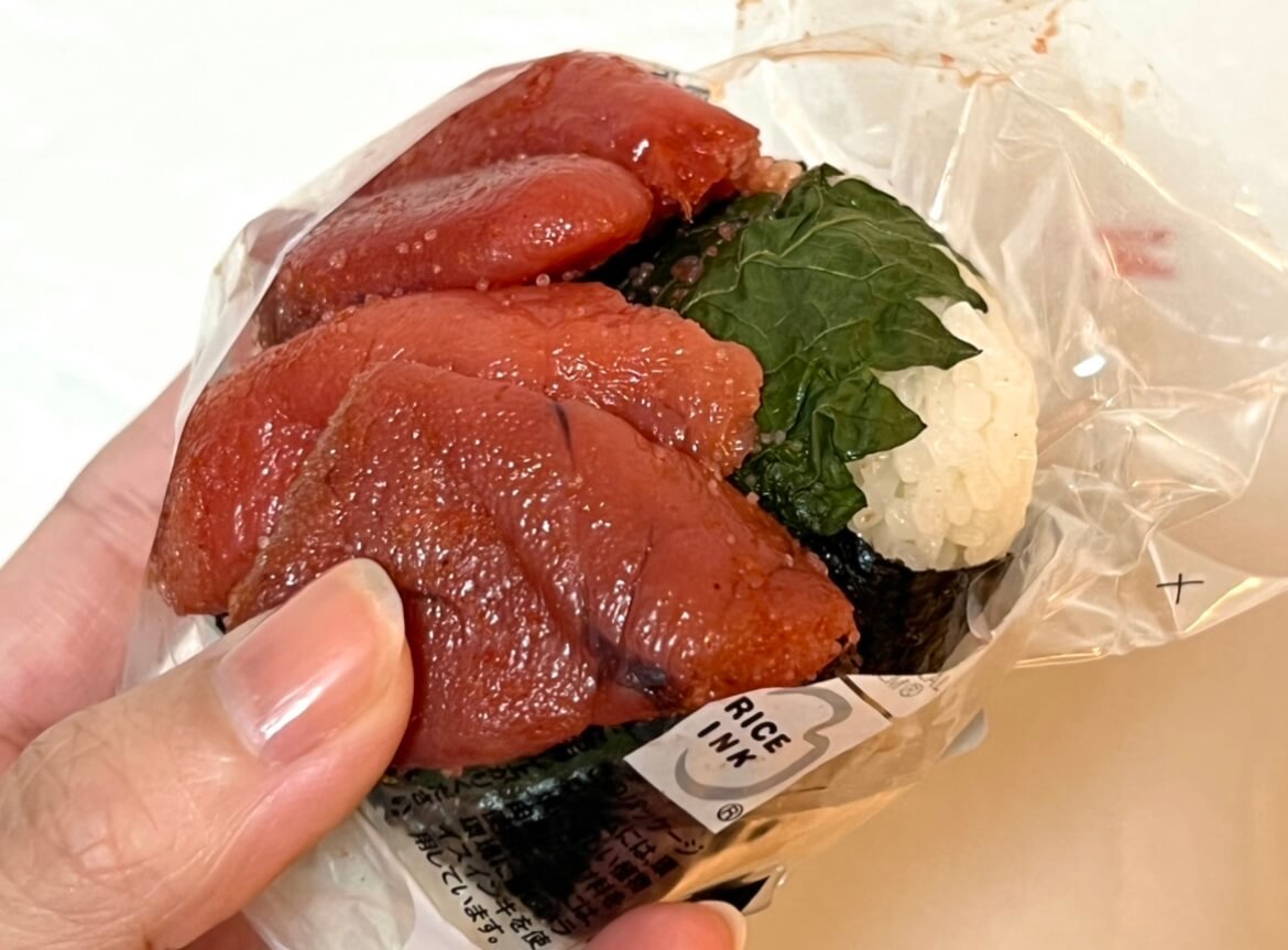 おにぎりをまじまじと観察してみると、白米のサイズは通常通りですが、上には明太子がドーンと4本も……!!