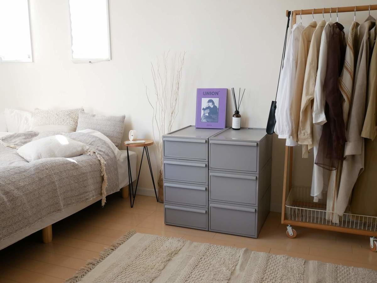 クローゼットの中だけでなく寝室に出し、さらに天板に小物をディスプレイしてお洒落に見せられるのもこの「クローゼットシステム」のいいところ。
