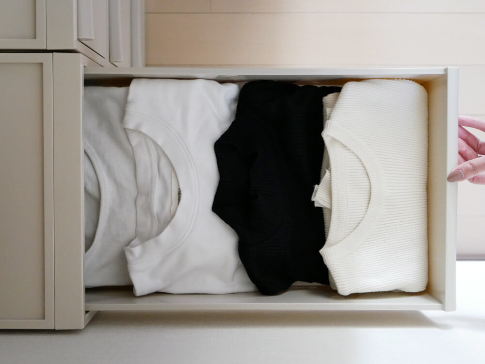 シャツやニット製品等の畳んだサイズにこだわった引出し内寸サイズ。 無駄を作らないサイズ感で、衣類がシワになりにくく、出し入れしやすいのもポイントです。