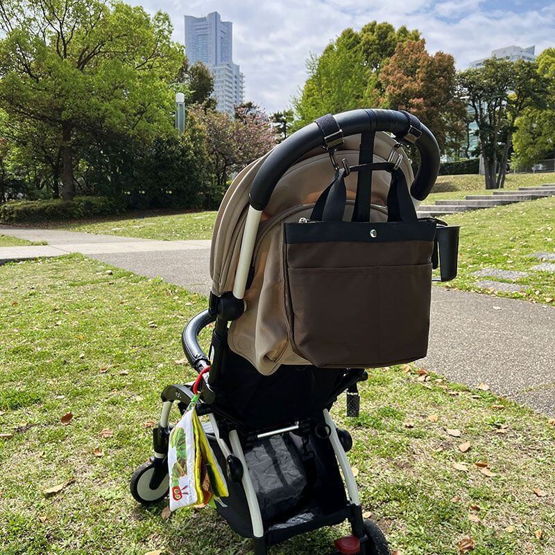 トート型なので、ベビーカーのフックに掛けて持ち運ぶことができて、より身軽に。