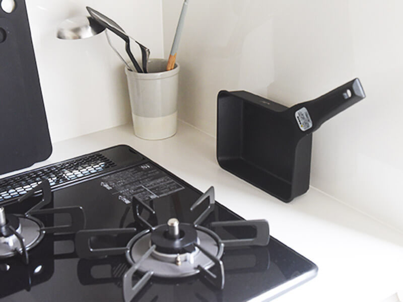 suttoのミニフライパンは一般的なものより少し深型。側面にリブがしっかりあるため、倒れずに立てることができます。だからコンロ横の狭いスペースにも、道具がぎっしり詰まったシンク下の引き出しにも、ちょっとした隙間に立てて収納OK。