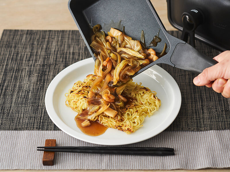 深さがあるから汁気のあるメニューが作りやすく、角を注ぎ口として使えるのも四角いフライパンのメリットです。