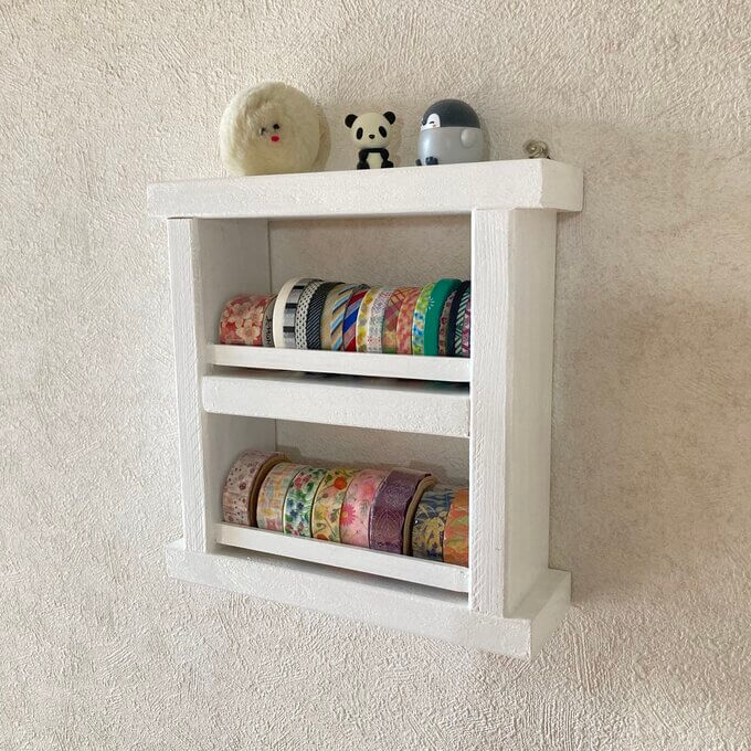 こちらのマステ収納のサイズは、約幅20cm・高さ20.7cm・奥行6.4cmです。ホワイトカラーだからこそ、色物のマスキングテープが映えて素敵なインテリアになりますよ。置いて、壁に設置して2wayで使える作品です。