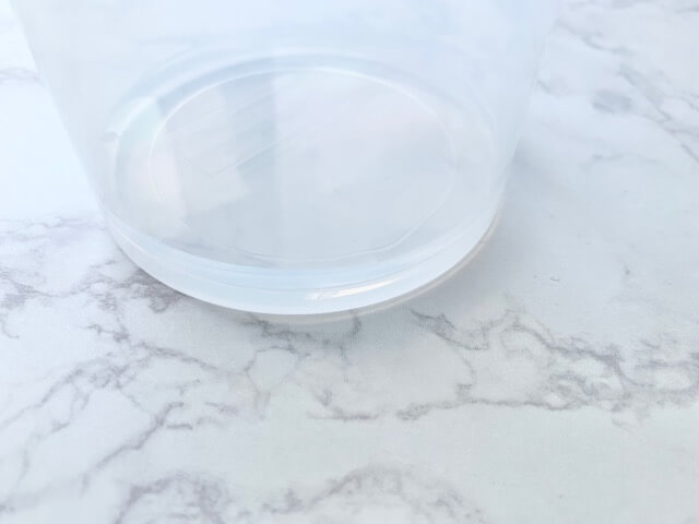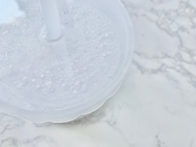 次に、容器の内側の線を目安に、水やぬるま湯を少量入れます。 水を少なめにすると硬めの泡に、少し多めにするとゆるめの泡になるので好みに合わせても◎