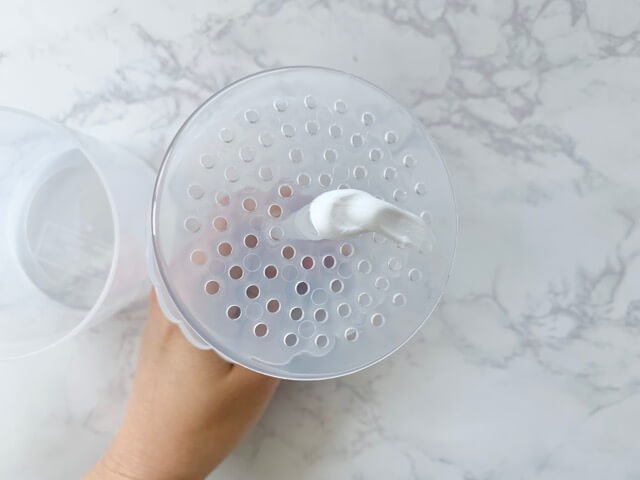 まず、スティックがついた面(穴が開いている)に、洗顔料を適量つけます。 固形石鹸の場合は、面にこすりつけます。