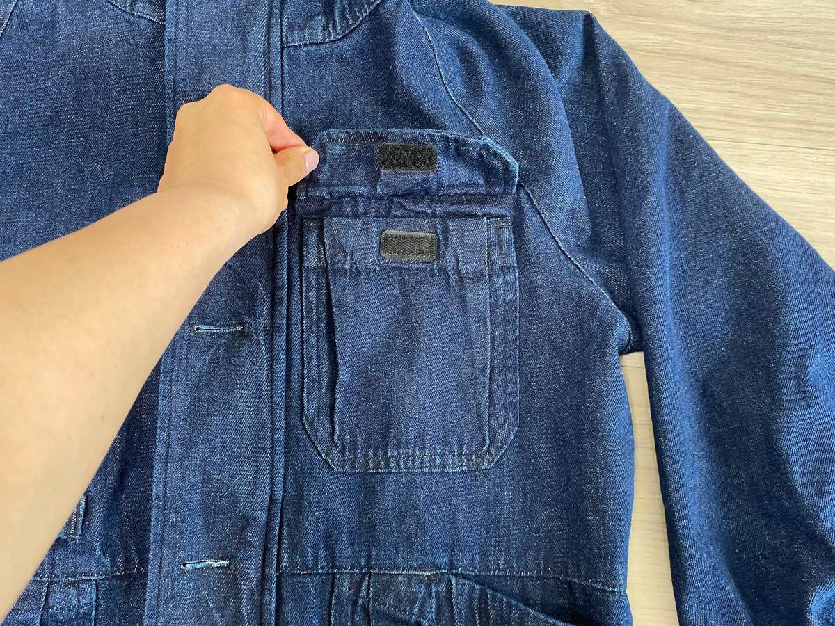 胸元のポケットは、面ファスナーに。より大切な物を入れるなら、こちらにインするのがベターですよ。