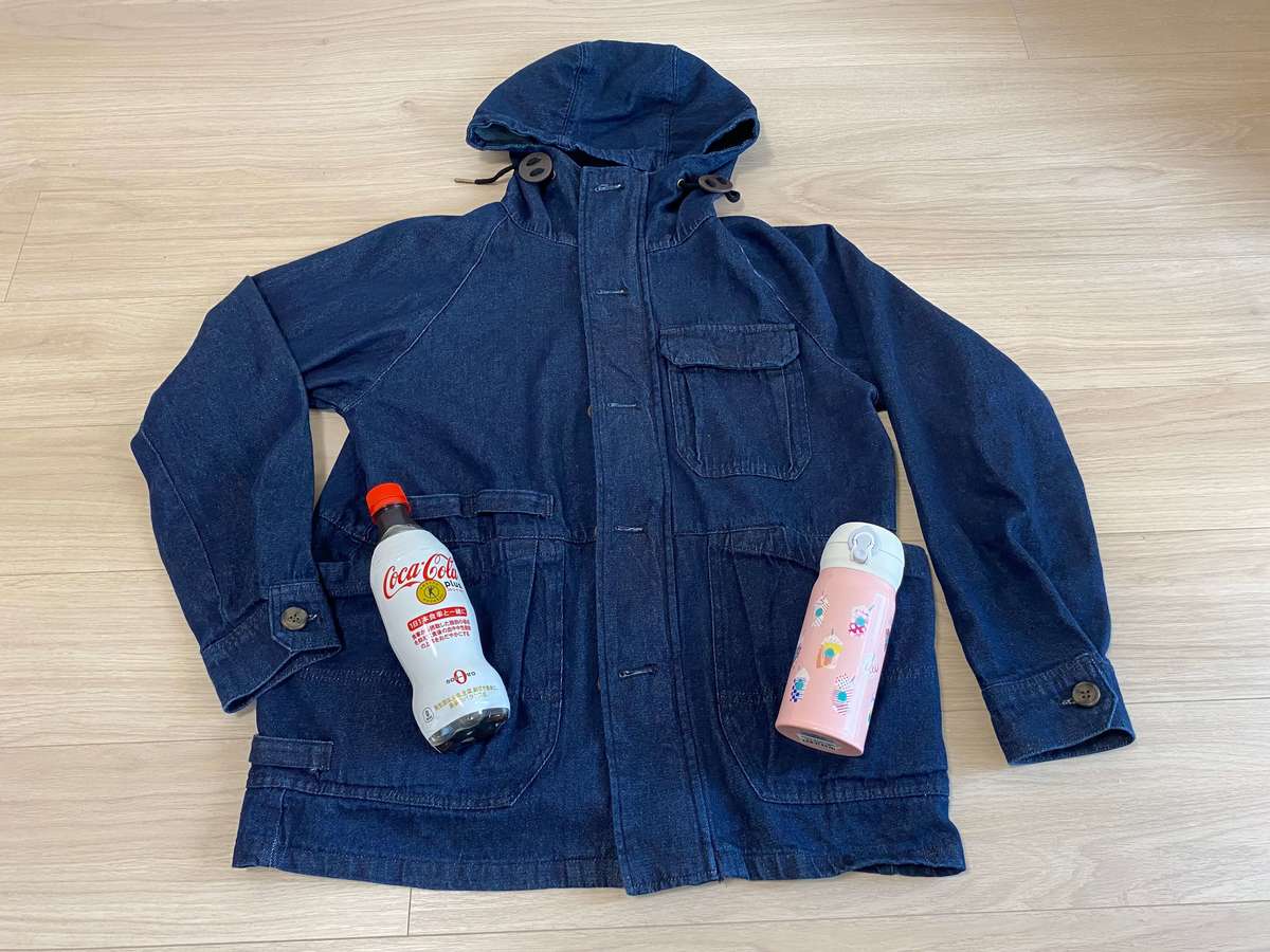 フードがついているのでちょっとした小雨のときも慌てなくてすみます。撥水はついていませんが、生地が厚めなので数分なら持ちこたえられます。