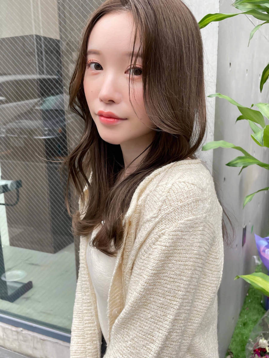長めの前髪をゆるく外に巻いて、トレンドヘアを狙ったセミロングです。