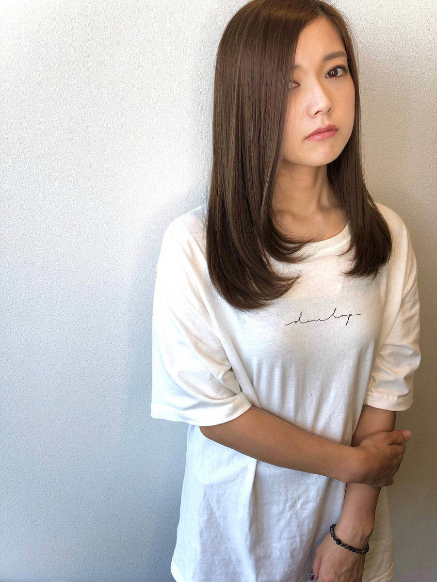 毛先をワンカールにした、ナチュラルな大人女子のストレートヘア。うる艶髪でおしゃれにキメてくださいね。