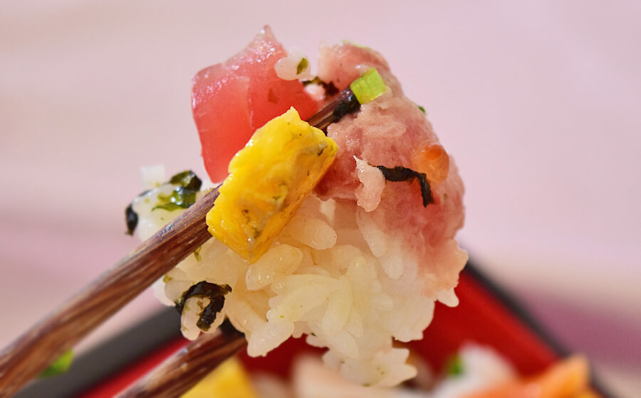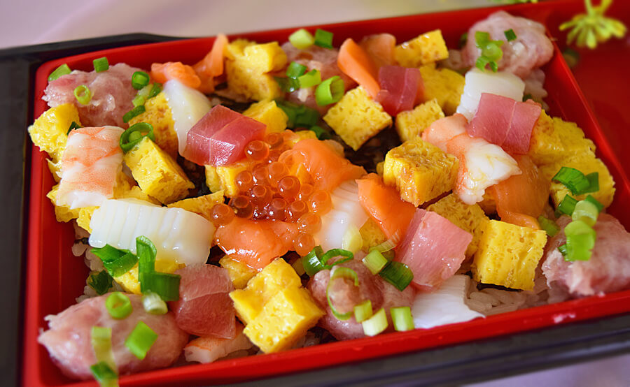 まぐろ・イカ・サーモン・海老・ネギトロ・玉子焼き・イクラがごはんを覆うようにのっています。添え付けされていた醤油をかけて食べました。