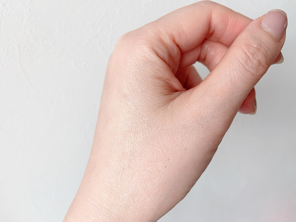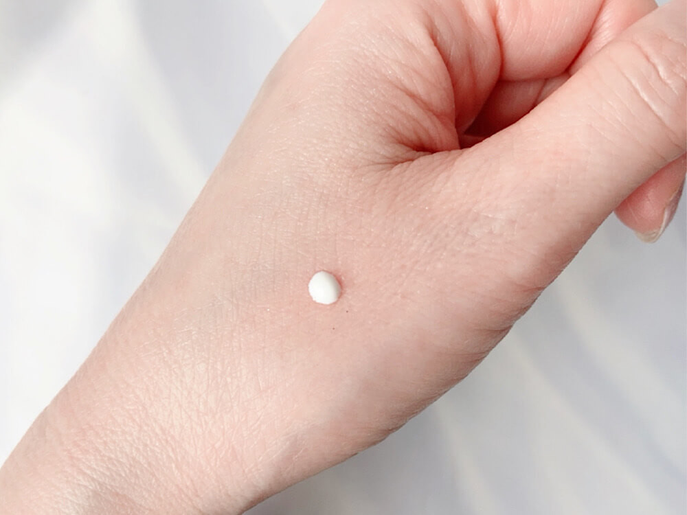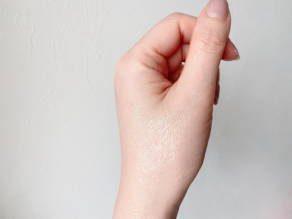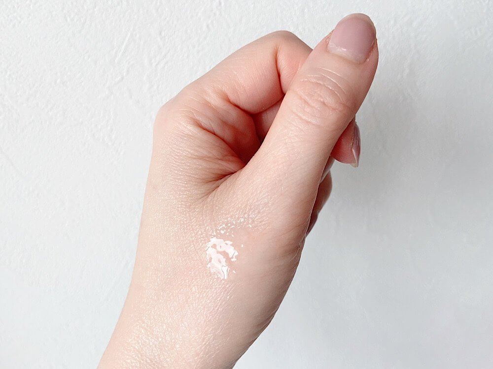 チューブから出した時は一瞬固さを感じますが、指で伸ばすとサーッと溶けるように広がります。肌に馴染むとベタつきはあまり感じず快適。