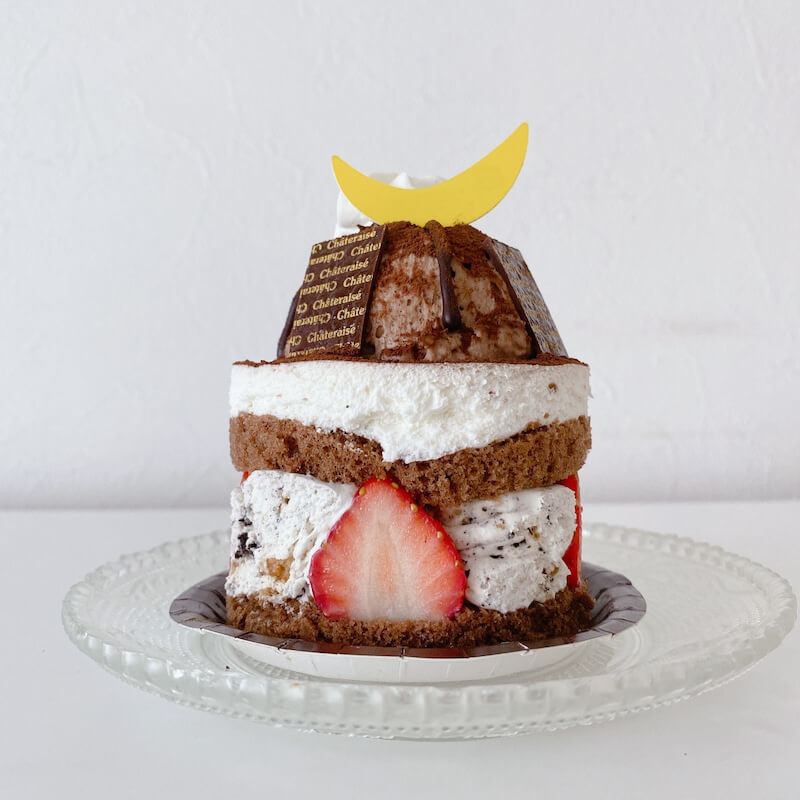 ココアスポンジ ↓ バナナソース ↓ マシュマロ ↓ アーモンドクッキークランチ入り ホイップクリーム ↓ チョコムース