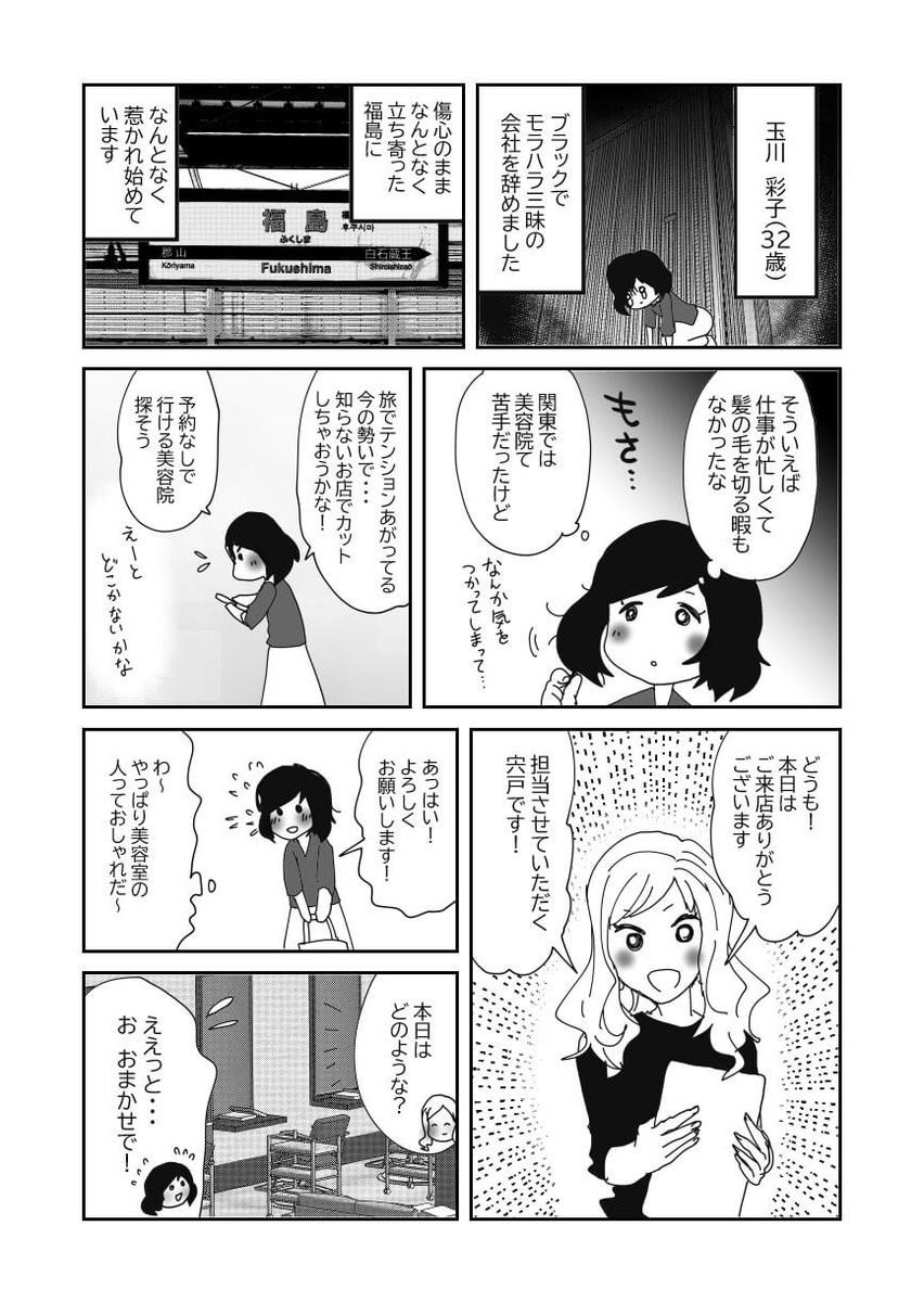 作者ふくふくまめさんによるツイッター漫画「福島に癒されるOLの話」シリーズの主人公、玉川彩子さんはブラック企業を退職したばかり。