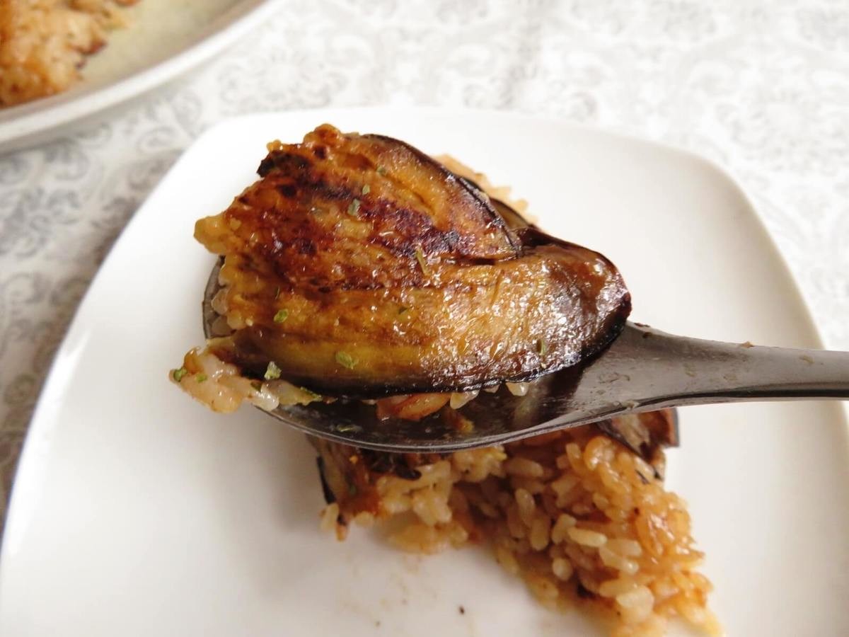 フライパンで焼いた上に炊飯したため、ナスがとろっとろ。スプーンで切れるくらい柔らかく、噛むたびにジュワーっと旨味が広がります。