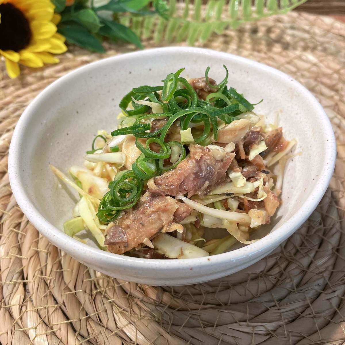 作り方はとても簡単でさば味噌煮を汁ごとボウルに入れて、そこに千切りしたキャベツを加え、しょうゆと黒こしょうで味付けし、和えるだけ!