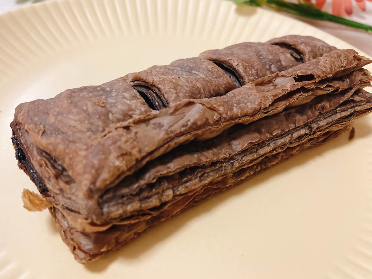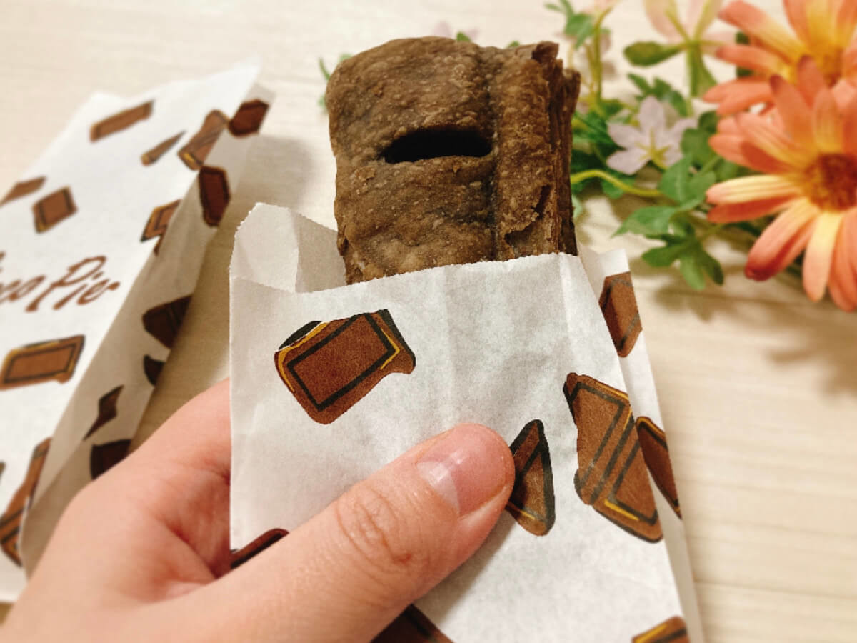 細長いかたちのパイの端から端まで、クリームがぎゅっと詰まっているので、どこをかじってもチョコレートを感じられます!