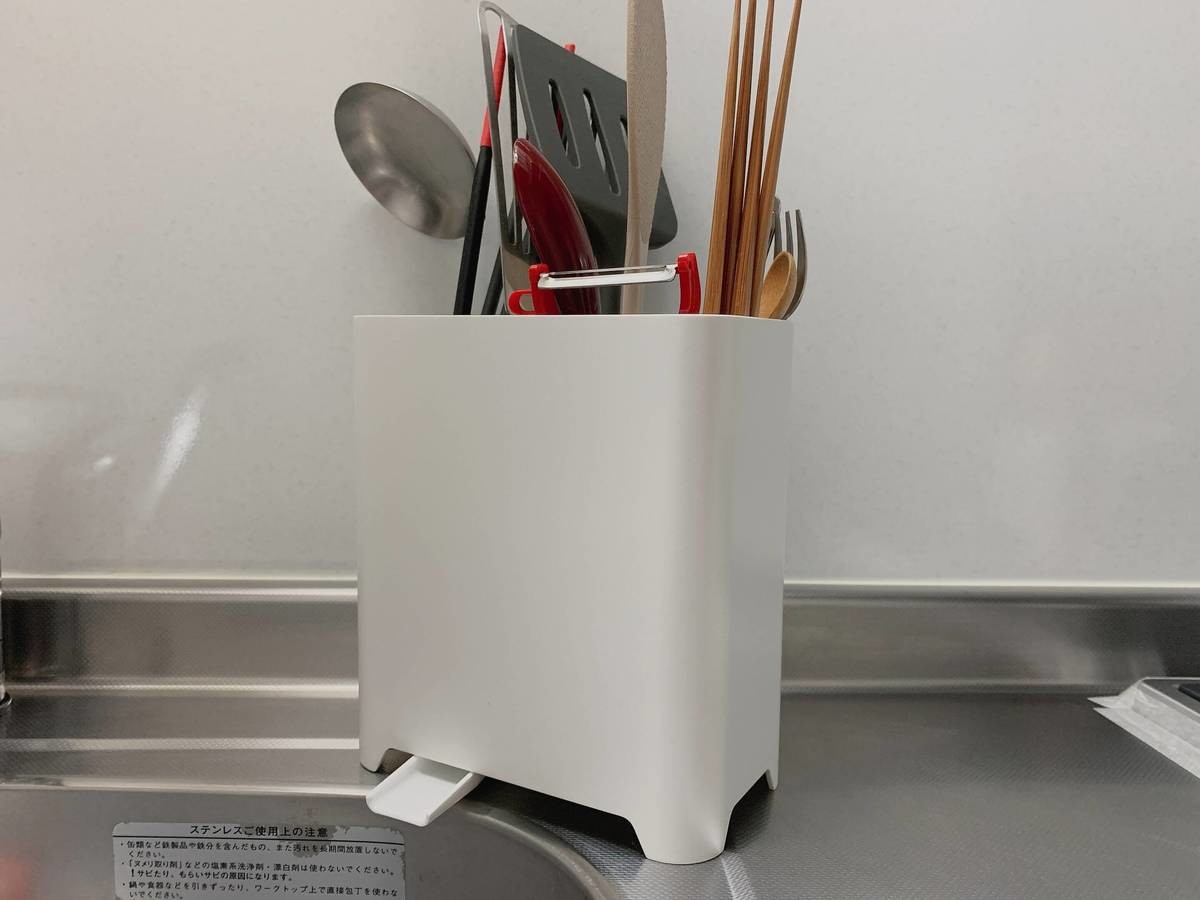 水はけがついているので、水切りラックとキッチンツールスタンドの1台2役をこなしてくれるんです。