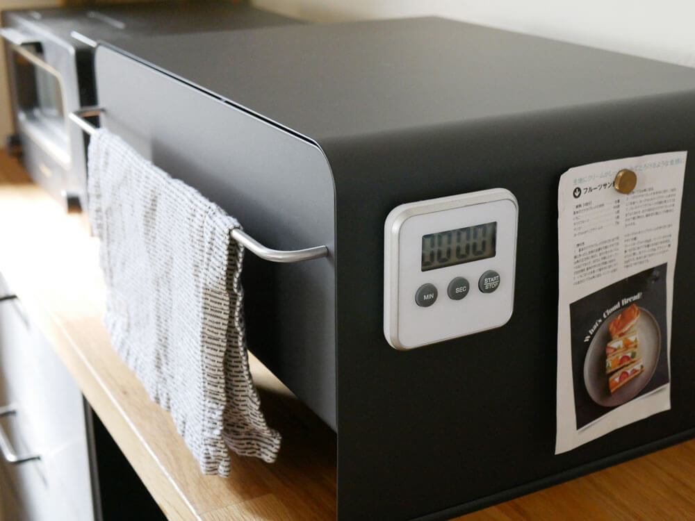 おまけ仕様なのが、布巾を掛けられる取っ手とマグネットの本体。 サラッと掛けただけで布巾までもがスタイリッシュに。タイマーやメモを磁石で本体に貼り付けられます。