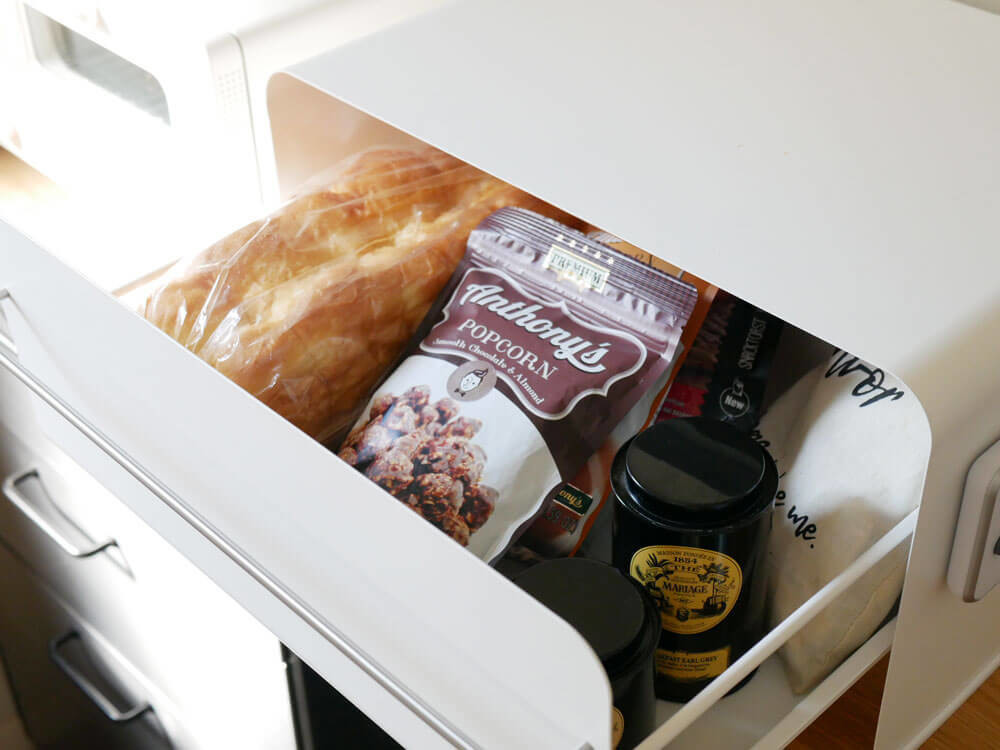 食パンや紅茶などキッチンの細々としたものを入れられる「ブレッドドロワー」。
