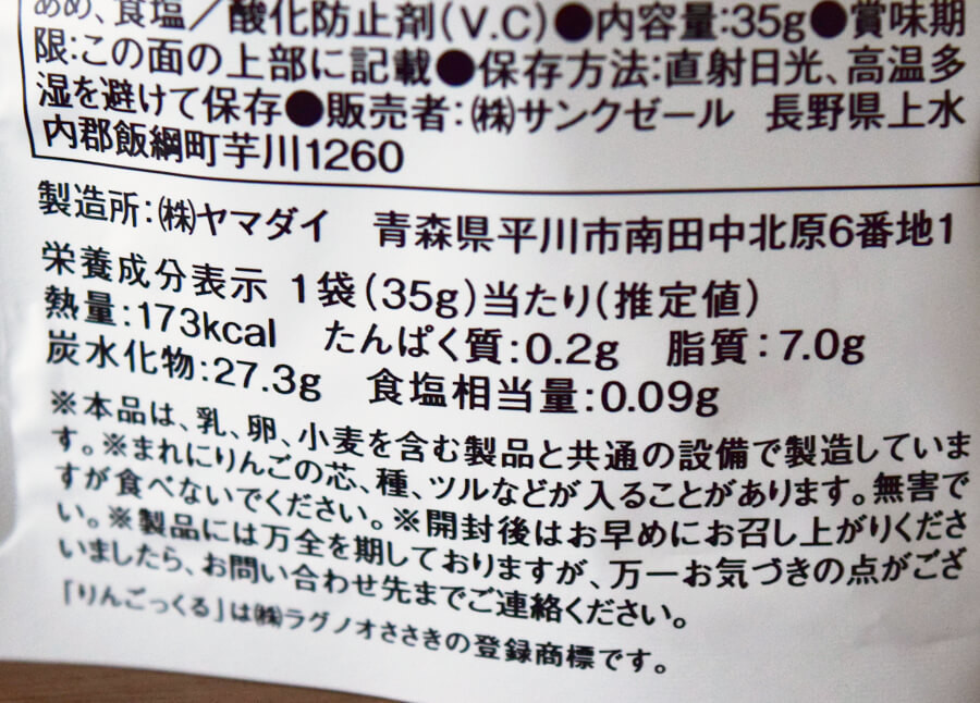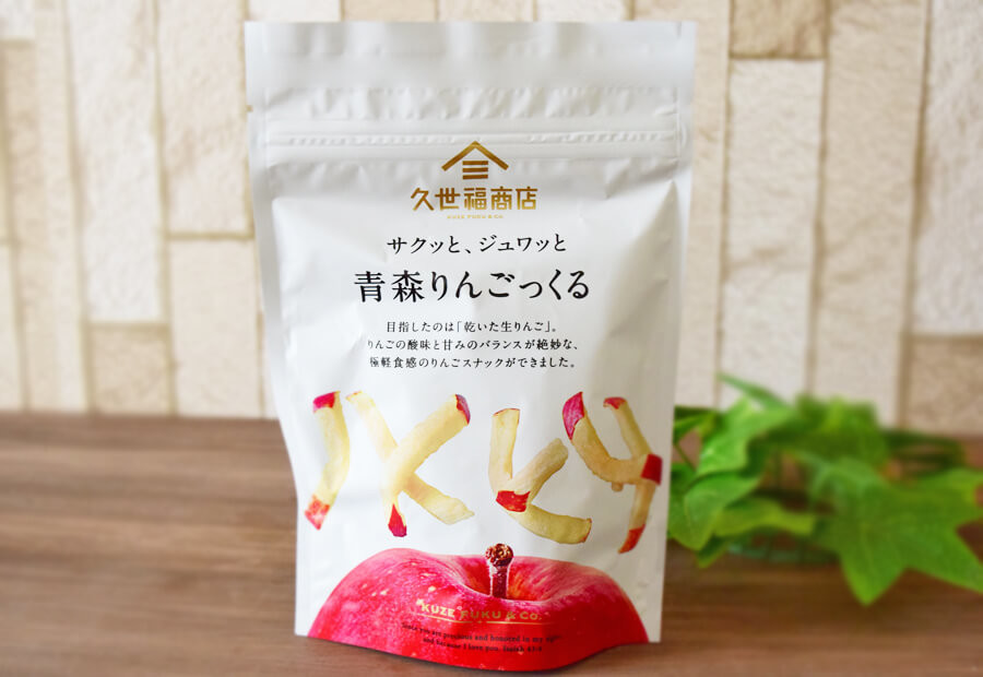 「乾いた生りんご」をイメージして作られたのだという、「青森りんごっくる」486円(税込)。上のポロショコラと同様、株式会社ラグノオささきが製品化に絡んでいる商品です。1袋35gのりんごスナックが入っています。