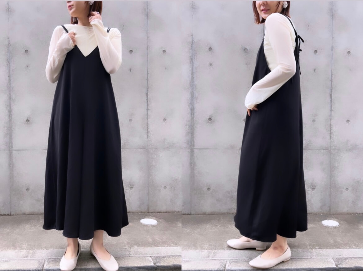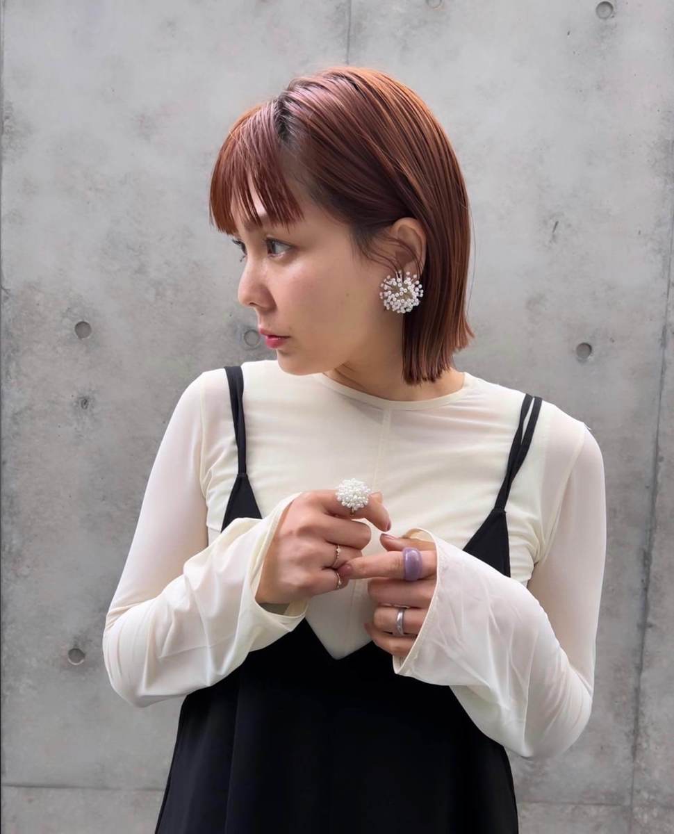 ワンピースを重ねてインナーとして着ます。 パールのアクセサリーを合わせて少し甘め なコーディネート。 色もデザインも重めのキャミワンピースですがシアー感のあるとトップスを合わせることで軽さをプラスして今の時期にちょうどいいスタイリングに。