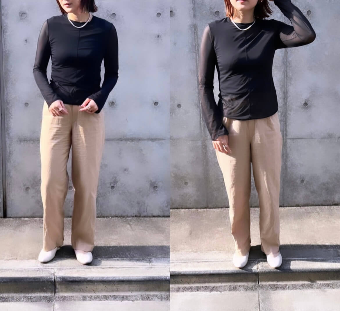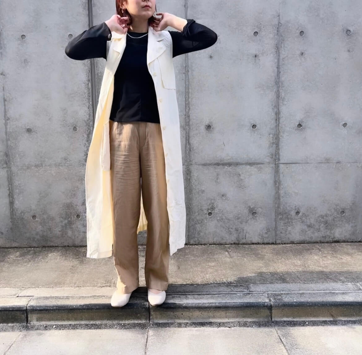 ブラックのトップスは、シックに着られるので、いつものアイテムにプラスするだけで大人っぽい落ち着いた雰囲気に! リネンのワイドパンツと合わせてカジュアルな要素をプラスして、大人カジュアルスタイルに。 パールのネックレスを合わせるとお出かけスタイルにも!
