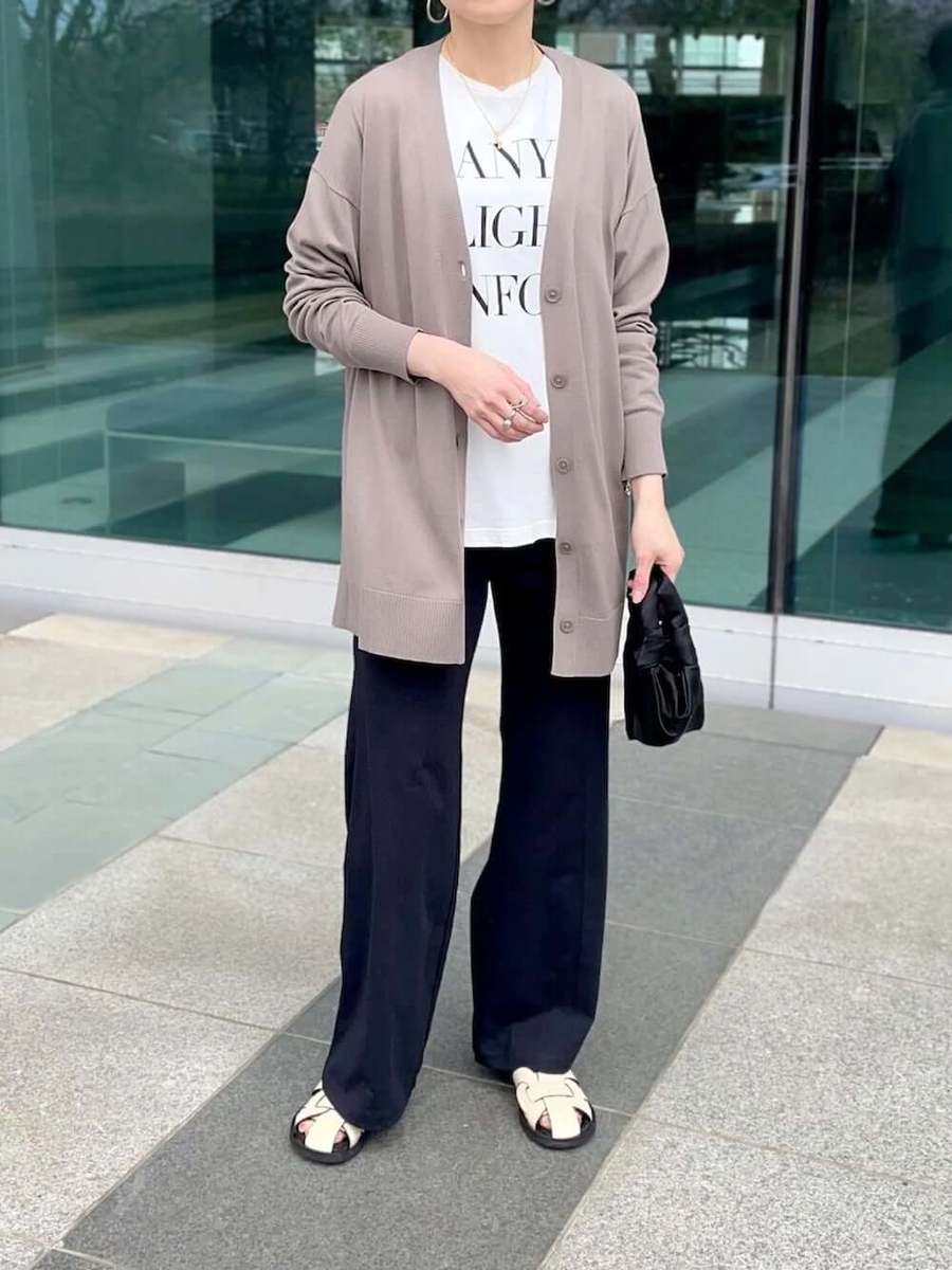 ゆったりとしたロングカーデでリラクシームードを楽しんで。トレンドのグルカサンダルで今どきの抜け感を作ります。
