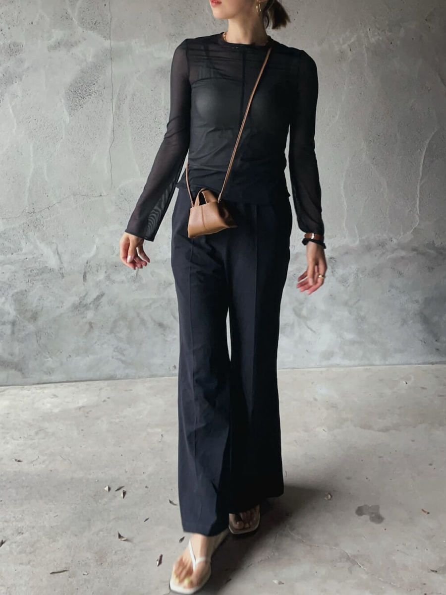 黒のワントーンコーデも、旬のシアーアイテムで作ると涼しげモードに。さらっと着るだけで今っぽコーデが完成します。