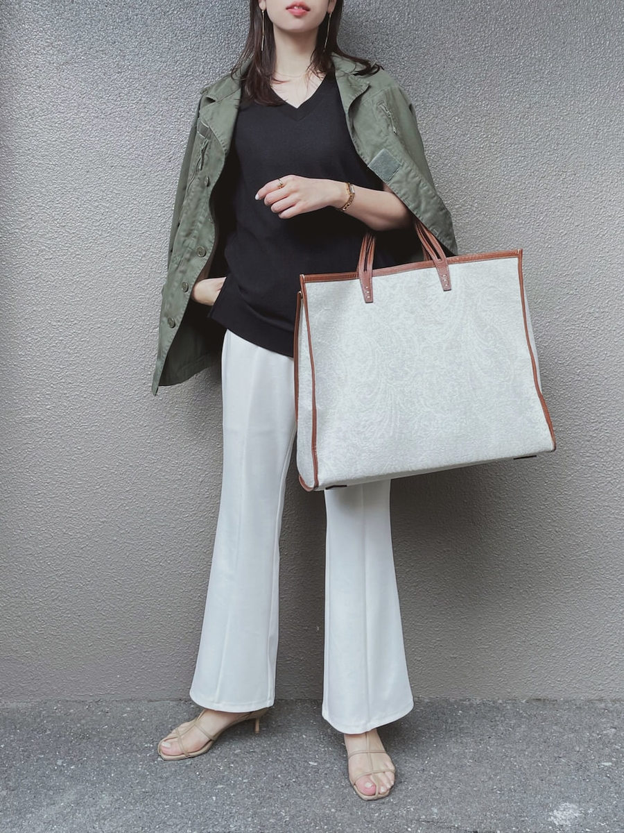 ナチュラル×黒ベスト×カーキジャケット