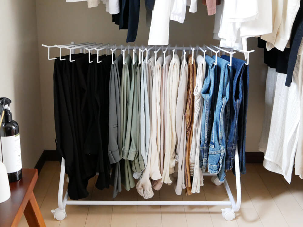 しかも、このハンガー1本1本が左右にスイングするんです! 動かないハンガーと異なり、左右に動かせることで取り出しやすく、しまいやすくもなっているんです。 なので20本きっちり掛けていても取りやすいのが◎。