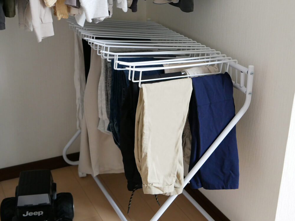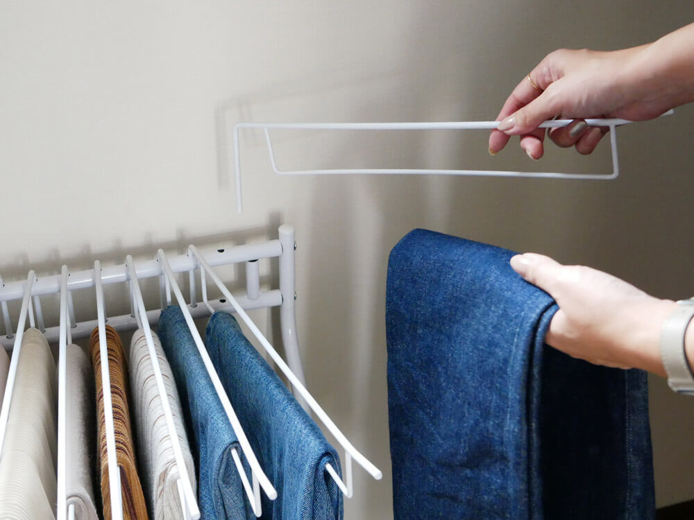固い生地のジーンズを動かないハンガーに掛けるのはなかなか大変。 でも取り外しができると、一本一本丁寧に掛けられますね。
