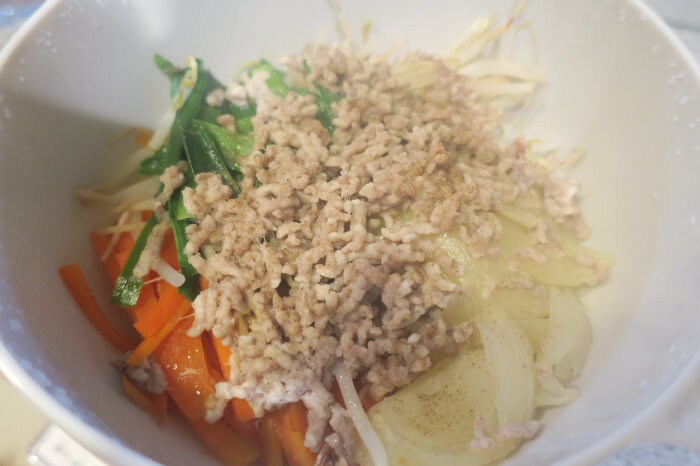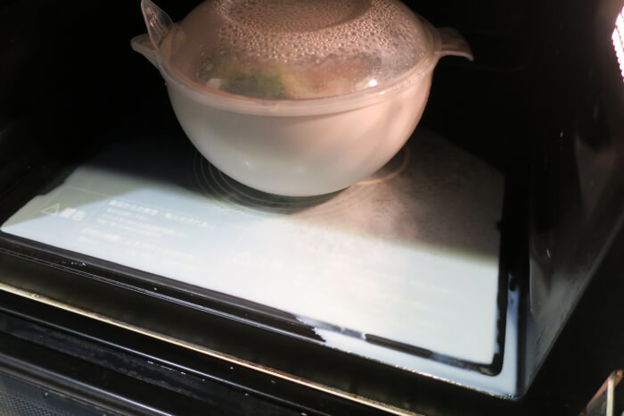 すべての素材と水をボウルに入れて、まとめてレンチンすると書かれていました!