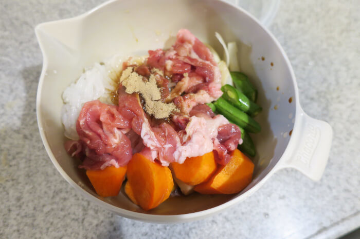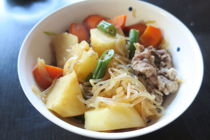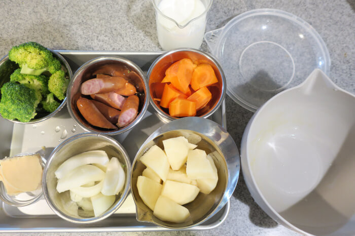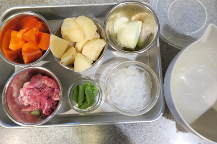 定番の家庭料理、肉じゃがも作れるとのこと。今回はレシピ通りの素材を用意しましたが、我が家のいつもの素材に変えても大丈夫そうです。
