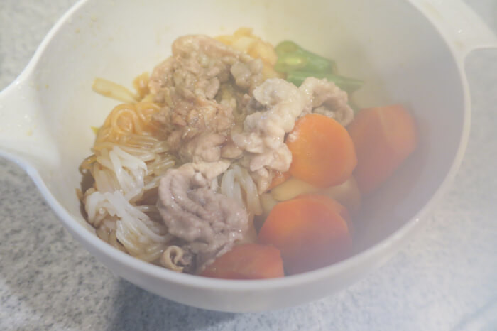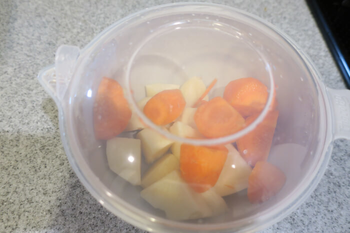 はじめに、火の通りにくいじゃがいもと人参を入れて、チン。