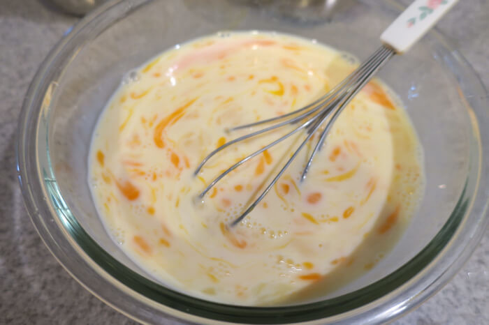 卵、牛乳、砂糖をボウルに入れ、よく混ぜます。 ちょこっとボウルだと、混ぜるにはやや小さかったので、大きいボウルを使いました。