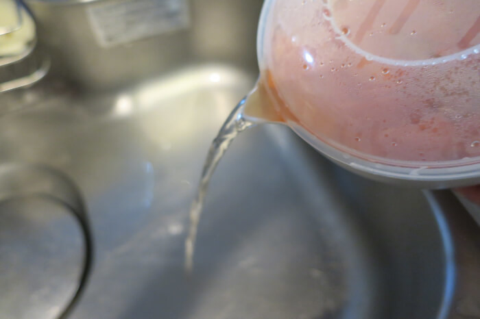 ふたを回転させて、蒸気弁をずらしたところ、勢いよく湯切りできるように!
