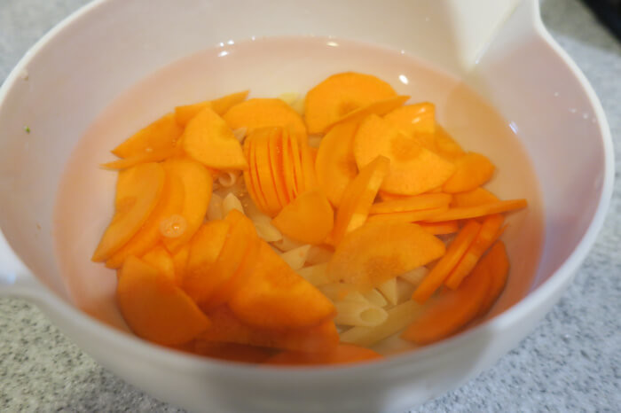 茹でる必要のある、人参とマカロニ、水を入れます。