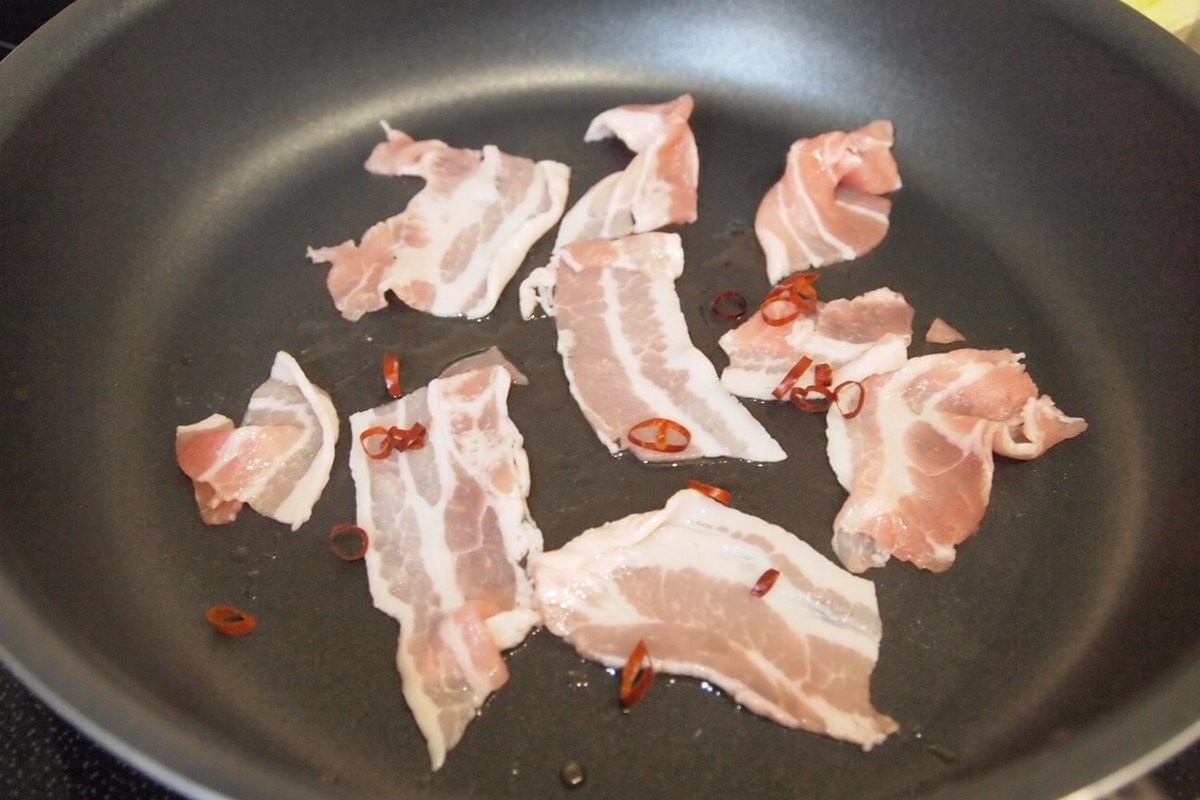フライパンにごま油を引き、火はつけず、豚バラ肉と赤唐辛子を入れます。豚バラ肉が大きい場合は、一口大にカットしてください。