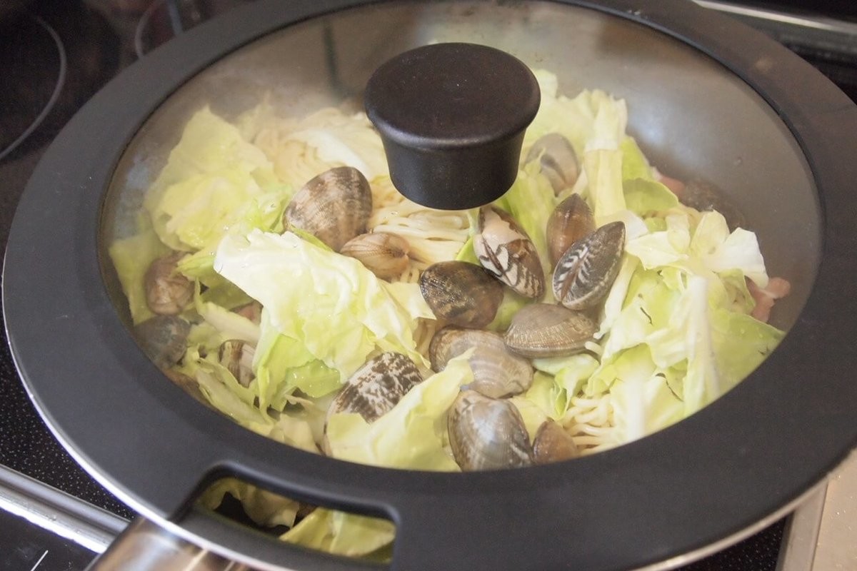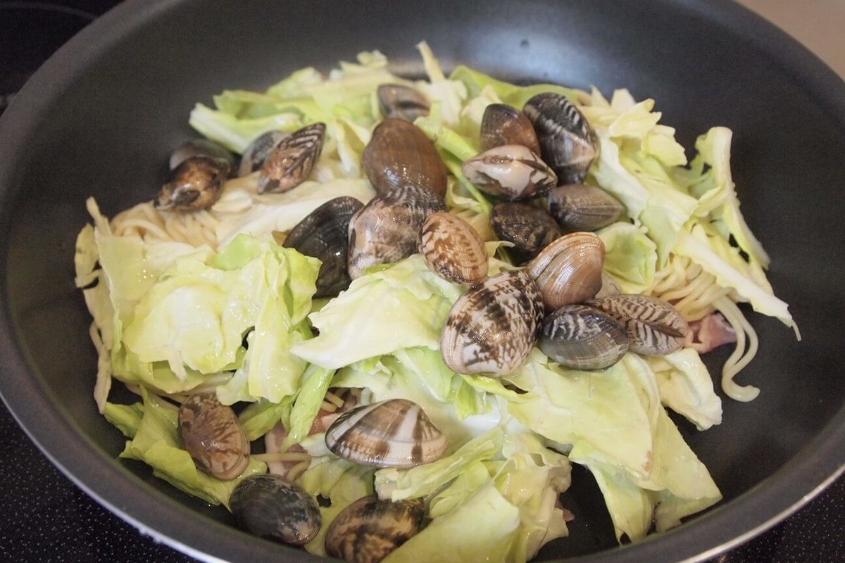 キャベツの上に、砂抜きしたあさりを殻ごとのせます。