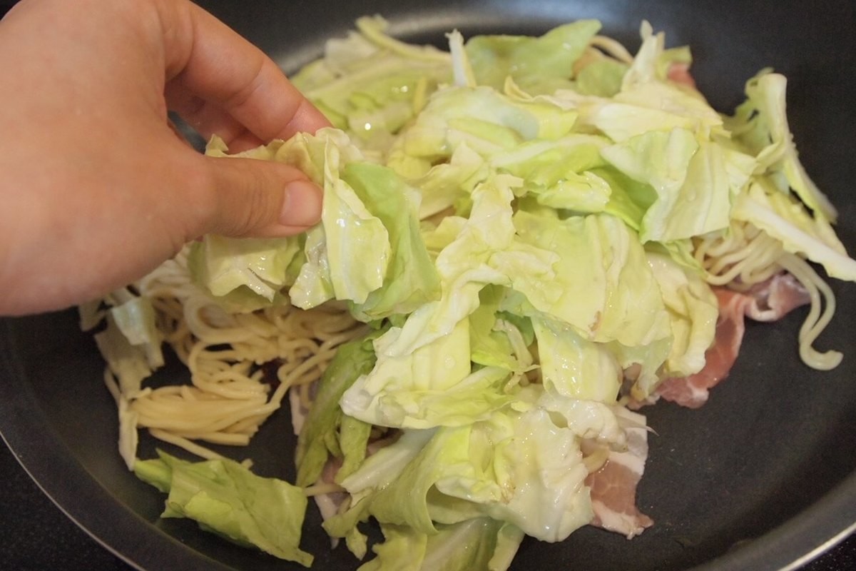 洗ったキャベツを食べやすい大きさにちぎり、麺の上にのせます。