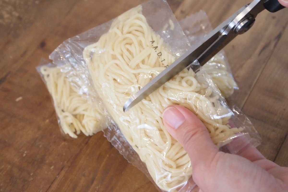 焼きそばを袋のまま十字にカットし、1/4サイズにします。ここでカットすることで、麺をほぐす手間を省くんだそうです。さすが平野レミさん!