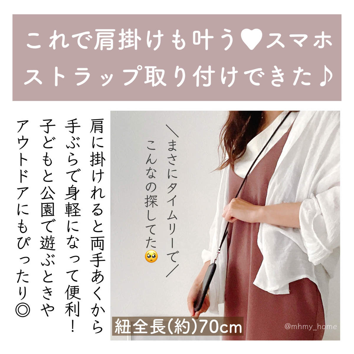 これでスマホ単体での肩掛けも叶います♪肩に掛けられると、両手があき身軽になって便利なんです!子どもと遊ぶときやアウトドアにもぴったり!まさにタイムリーでこんなの探してた私は、出会えた瞬間、大興奮でした(笑)!