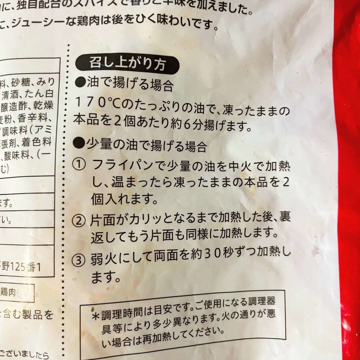 パケ裏を見ると「下味をつけた鶏もも肉に、独自配合のスパイスで香りと辛みを加えました。」と記載されていました。