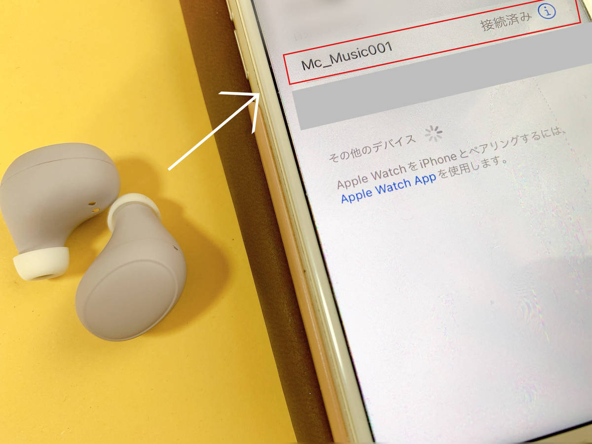 携帯のBluetoothをONにして、デバイス名「Mc_Music001」をタップします。点滅していた片方のイヤホンランプが消灯すれば、接続完了です。