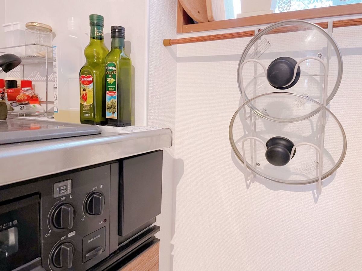 キッチンの空いているスペースに突っ張り棒をとりつけ、そこに鍋蓋収納を引っ掛けるだけ。