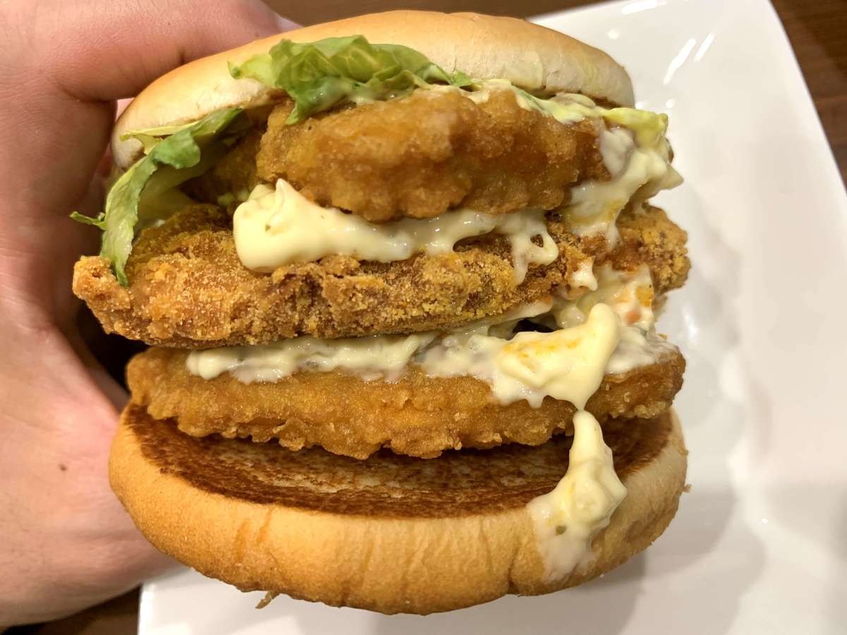 いただきま~す!...ってかぶりつくのが大変!チキンが3段なので、食べるだけでも一苦労です(笑)。ふんだんに入れたタルタルソースも最高!