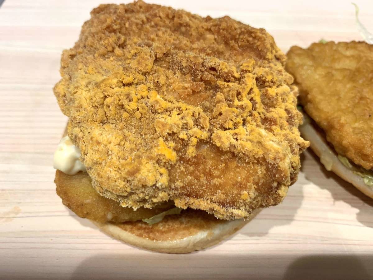 ですが、今回のアレンジではバンズの代わりにシャカチキが挟まっています。チキン・チキン・チキンで背徳過ぎます。