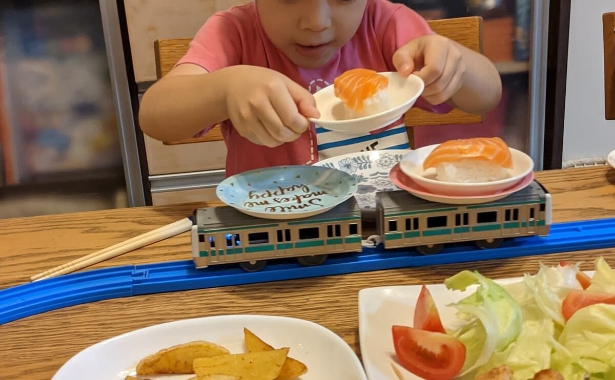 準備は大変ですが、お茶の間がにぎやかになる「プラレール回転寿司」でハレの日を祝うことも。