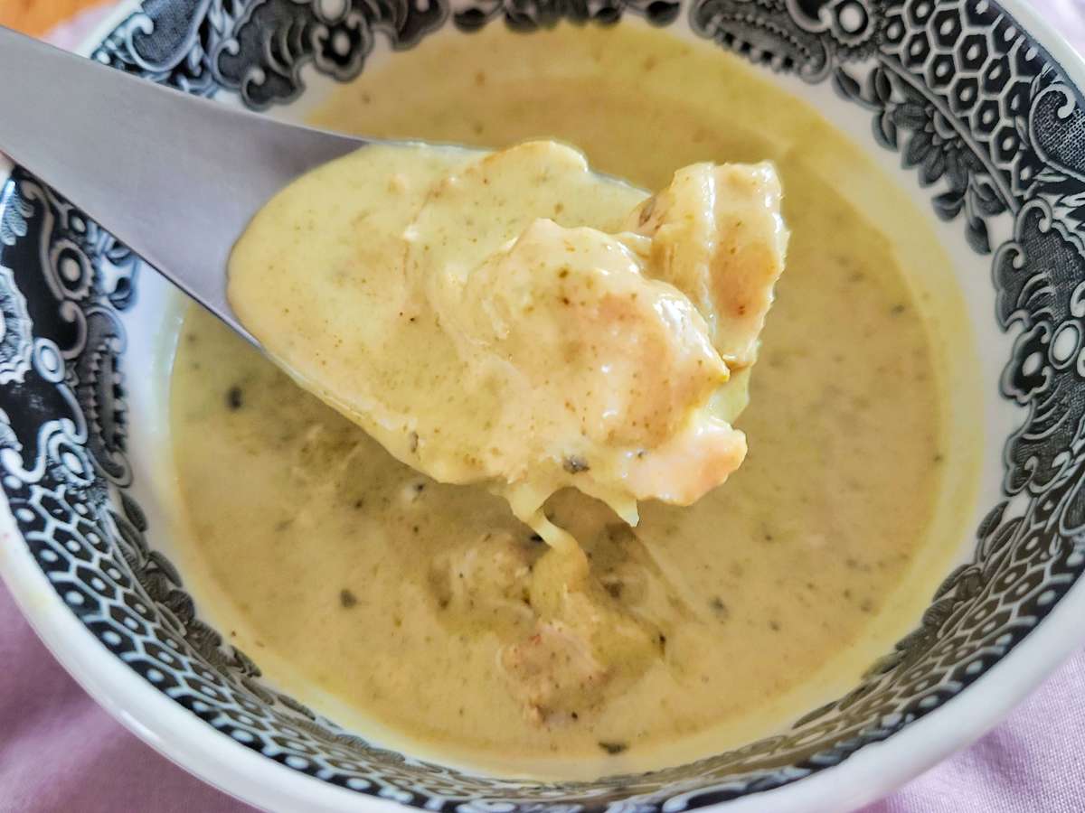 蒸し鶏肉に、ココナッツミルクパウダー、しょうが、にんにく、炒めたまねぎ、レモングラス、こぶみかんの葉ピューレ、バジル、ターメリックなどを使い、タイ感満載のカレーです。