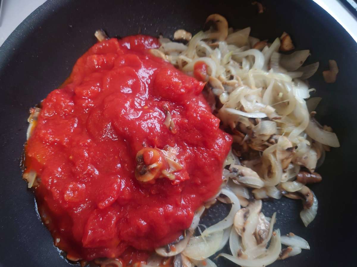 冷蔵庫にあるものでトマトに合いそうなものを探したら、玉ねぎと冷凍保存キノコがあったのであわせて炒めます。そこにカットトマト缶を丸々1個投入!
